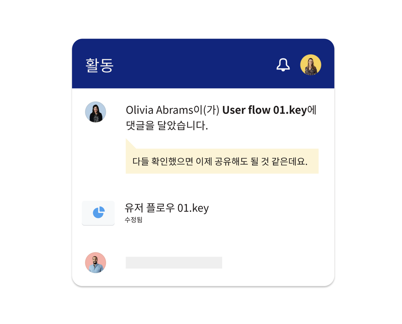 프로젝트 진행 상황이 업데이트되거나 할 일이 추가됐을 때 알림을 받아 보고, 실시간으로 변경되는 최근 활동을 확인해 언제나 최신 정보를 속속들이 파악하세요.